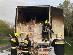 Bútorokat szállító kamion rakománya gyulladt ki tegnap kora este Pákozd és Sukoró között. A sofőr, miután észrevette, hogy füstöl a kamion, félrehúzódott, és a vontatmányt lekapcsolta a nyerges vontatóról. A székesfehérvári hivatásos tűzoltók a katasztrófavédelmi műveleti szolgálat irányítása mellett korongos gyorsdarabolóval nyílást vágtak a pótkocsi tetején, és habbal árasztották el a rakteret. A lapra szerelt bútorokat targonca rakodta ki, miközben a mélyen beizzott részeket is eloltották a tűzoltók.